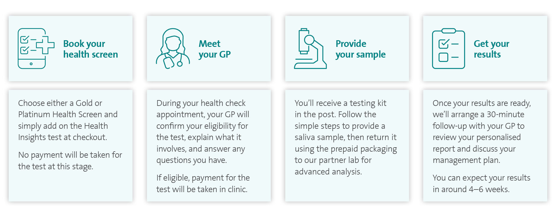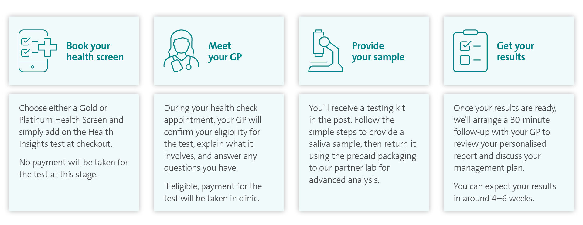 You can add the Health Insights test to our Gold or Platinum private health checks for £399.