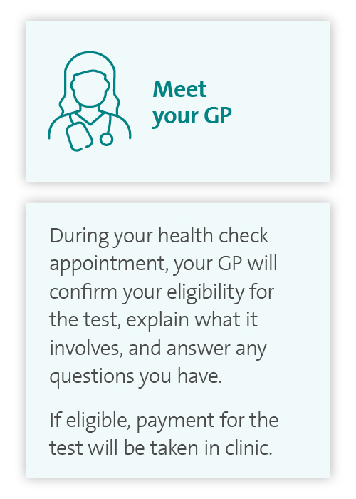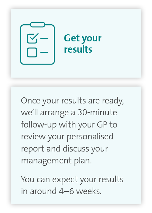The Health Insights Test helps identify your genetic risk for four common health conditions. Eligibility criteria vary depending on the condition and will be confirmed by your GP during your appointment. Your doctor will also answer any questions you have before testing.