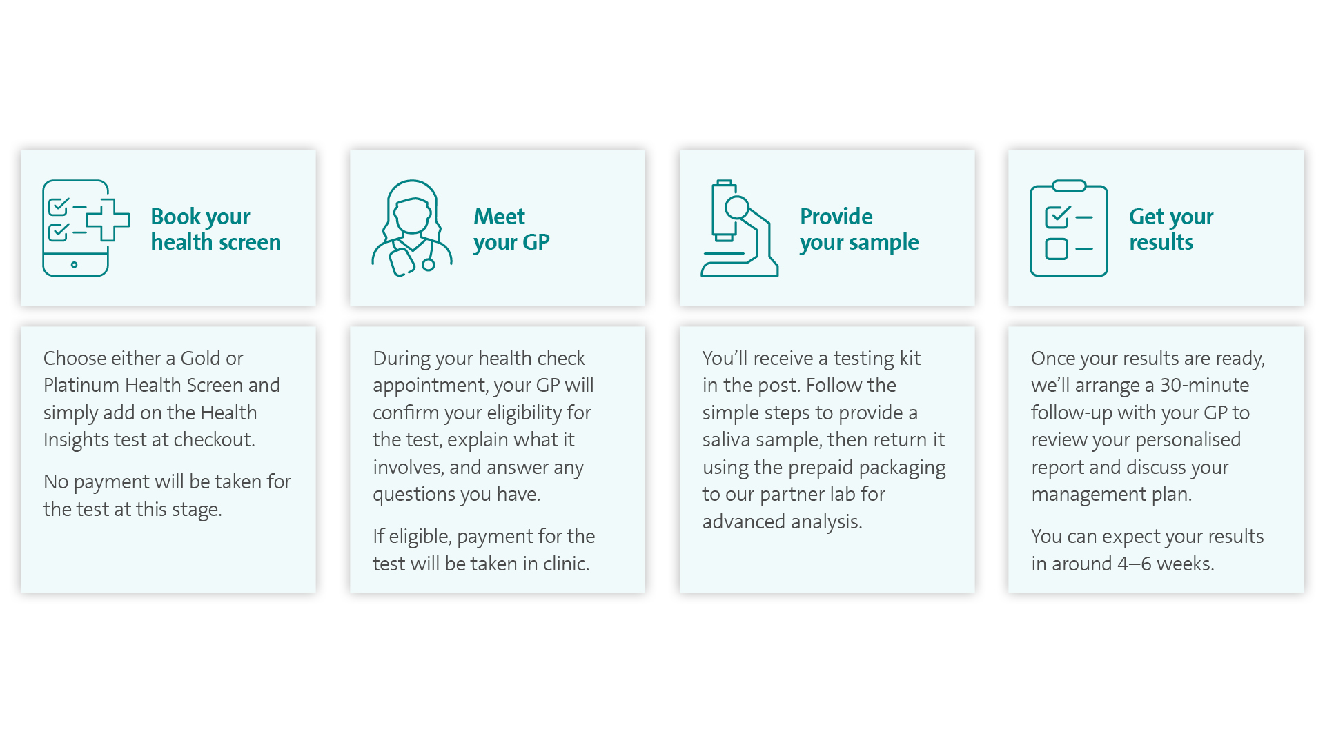 You can add the Health Insights test to our Gold or Platinum private health checks for £399.